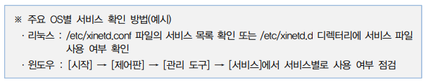 - 안전하지 않은 서비스, 프로토콜, 데몬에 대해서는 추가 보안기능 구현