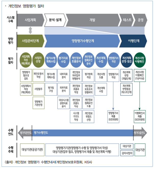 - 공공기관은 개인정보처리시스템 신규 개발 및 변경 시 분석·설계 단계에서 개인정보보호위원회가 지정한 영향평가기관을 통하여 영향평가를 수행하고 그 결과를 개발 및 변경 시 반영