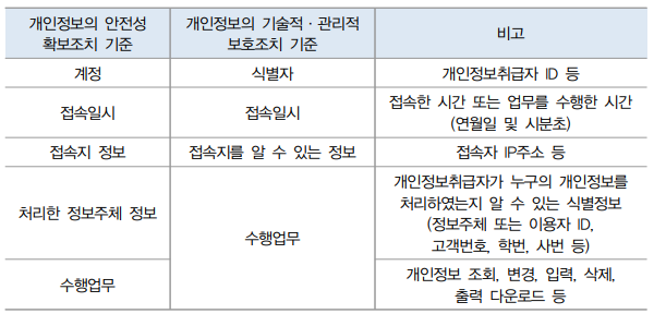 - 개인정보의 안전성 확보조치 기준 제8조(접속기록의 보관 및 점검)