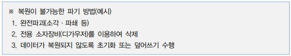 - 데이터 완전삭제 또는 저장매체 완전파기 조치 등