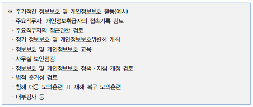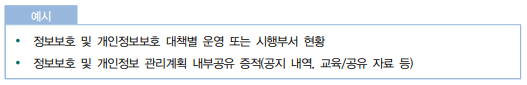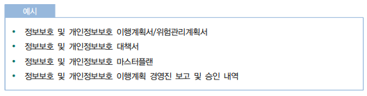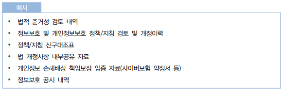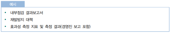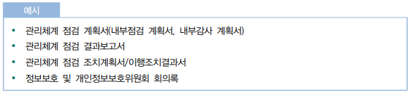 1.4.3 관리체계 개선 ■ 인증기준 법적 요구사항 준수검토 및 관리체계 점검을 통하여 식별된 관리체계상의 문제점에 대한 원인을 분석하고 재발방지 대책을 수립·이행하여야 하며, 경영진은 개선 결과의 정확성과 효과성 여부를 확인하여야 한다. 법적 요구사항 준수검토 및 관리체계 점검을 통하여 식별된 관리체계상의 문제점에 대한 근본 원인을 분석하여 재발방지 및 개선 대책을 수립·이행하고 있는가? 재발방지 및 개선 결과의 정확성 및 효과성 여부를 확인하기 위한 기준과 절차를 마련하고 있는가? ■ 관련법규 개인정보 보호법 제29조(안전조치의무) 개인정보의 안전성 확보조치 기준 제4조(내부관리계획의 수립·시행) 개인정보의 기술적·관리적 보호조치 기준 제3조(내부관리계획의 수립·시행 ■ 증적예시 ■ 결함사례